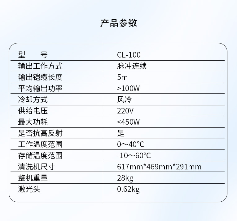 該清洗機依托MOPA 結(jié)構的優(yōu)勢,配備 100W 清洗式脈沖光纖激光器作為清洗光源,激光器采用主振蕩器功率放大 MOPA(Master Oscillator Power Amplifier)結(jié)構,其中主振蕩利用半導體激光器作為種子源,功率放大則通過行波光纖放大器來實現(xiàn)。本款 MOPA 光纖激光器具有脈沖寬度和頻率獨立可調(diào)的特點,在對脈寬和頻率進行改動的情況下仍可保持較高的穩(wěn)定峰值功率輸出,以適應更廣泛的清洗場景。